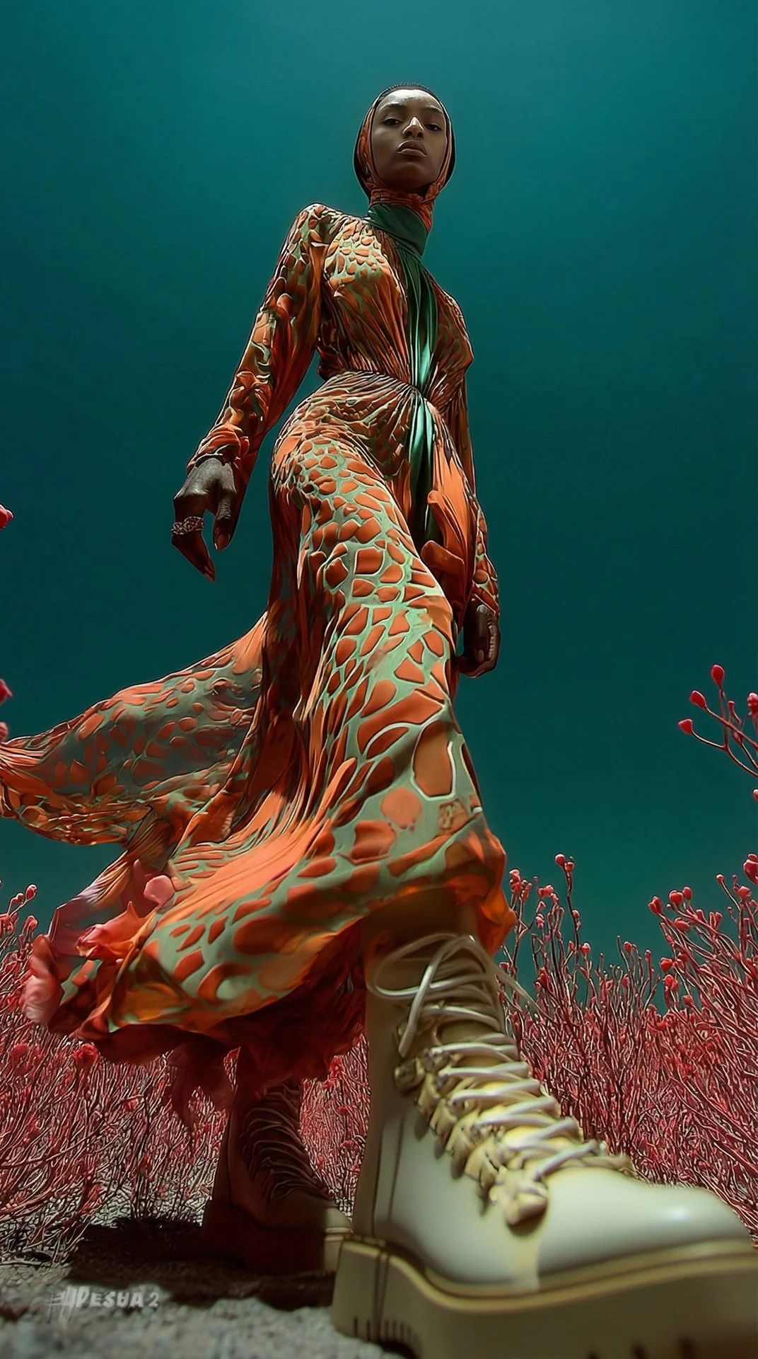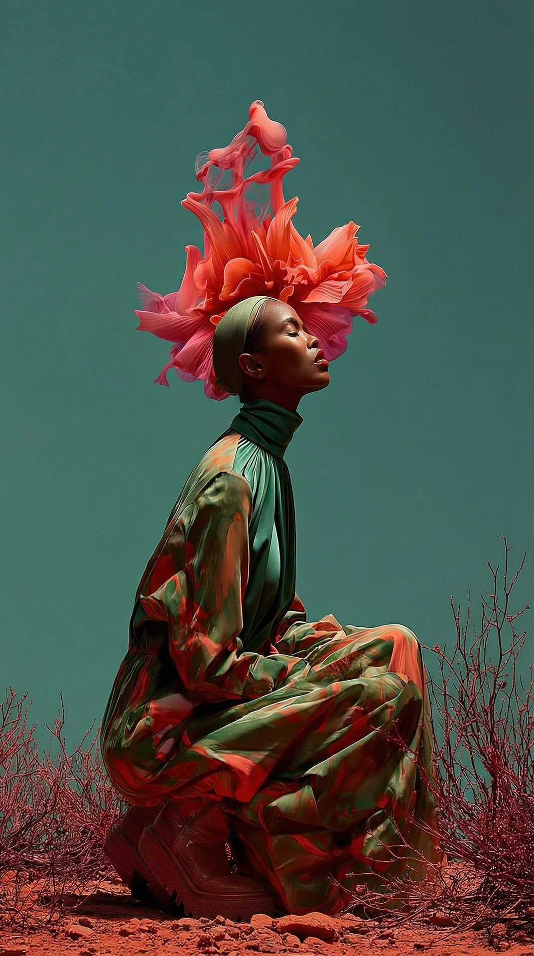 This piece merges avant-garde fashion with visual art to convey strength, identity, and evolution. Every element, from the texture of the dress to the composition of the environment, has been crafted to evoke impact.